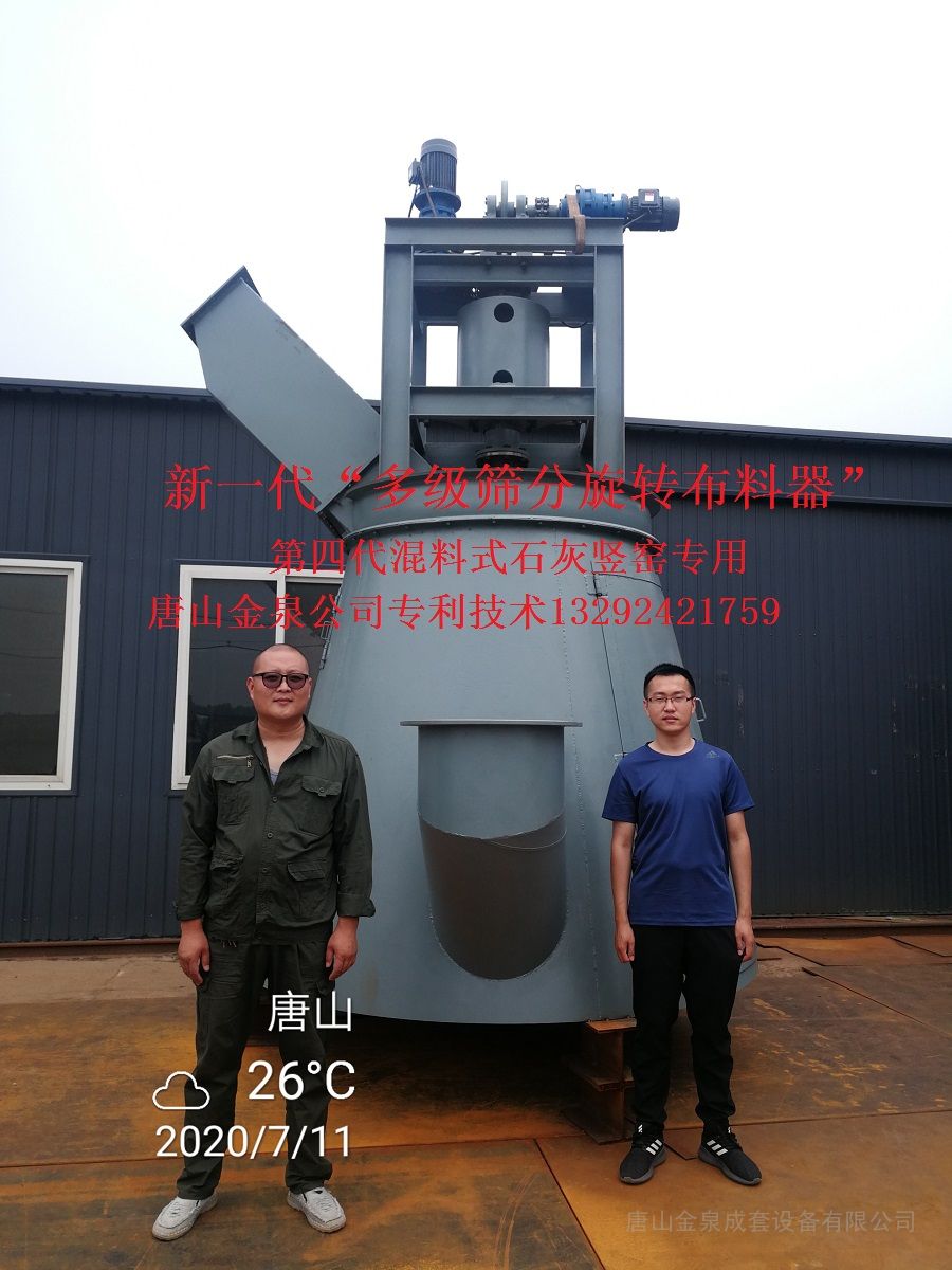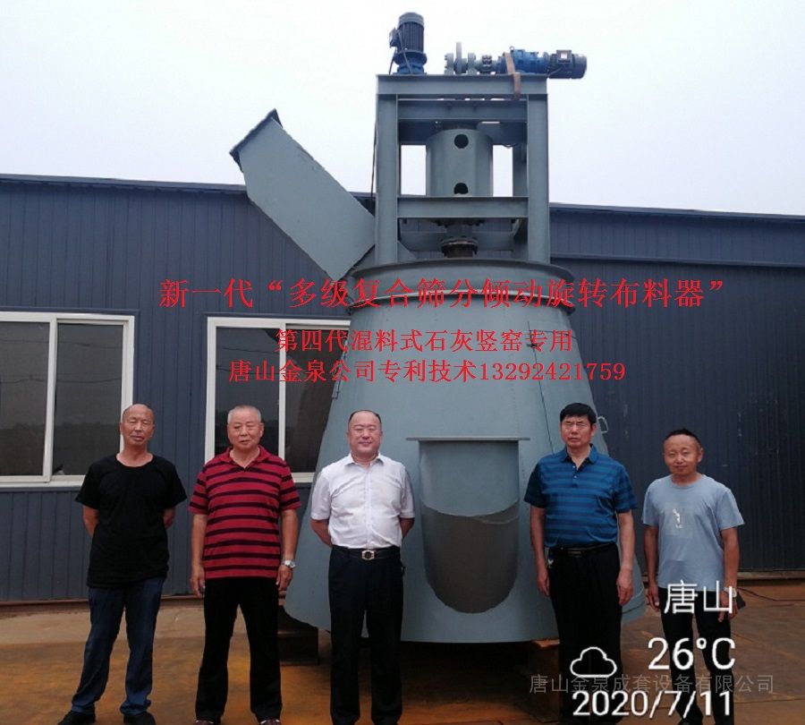 唐山金泉公司经过多年实践和研究,成功的推出了“新一代多级复合筛分倾动旋转布料器”成套装置,可以把不同粒度的石料通过多级复合旋转筛分体和倾动布料装置在炉内进行复合分级筛分及定点布料,可以把石料按照不同粒径根据炉体圆周半径进行差别化布料。在布料的过程中实现把小粒度石料通过可倾动布料装置在窑壁周边进行定点布料。