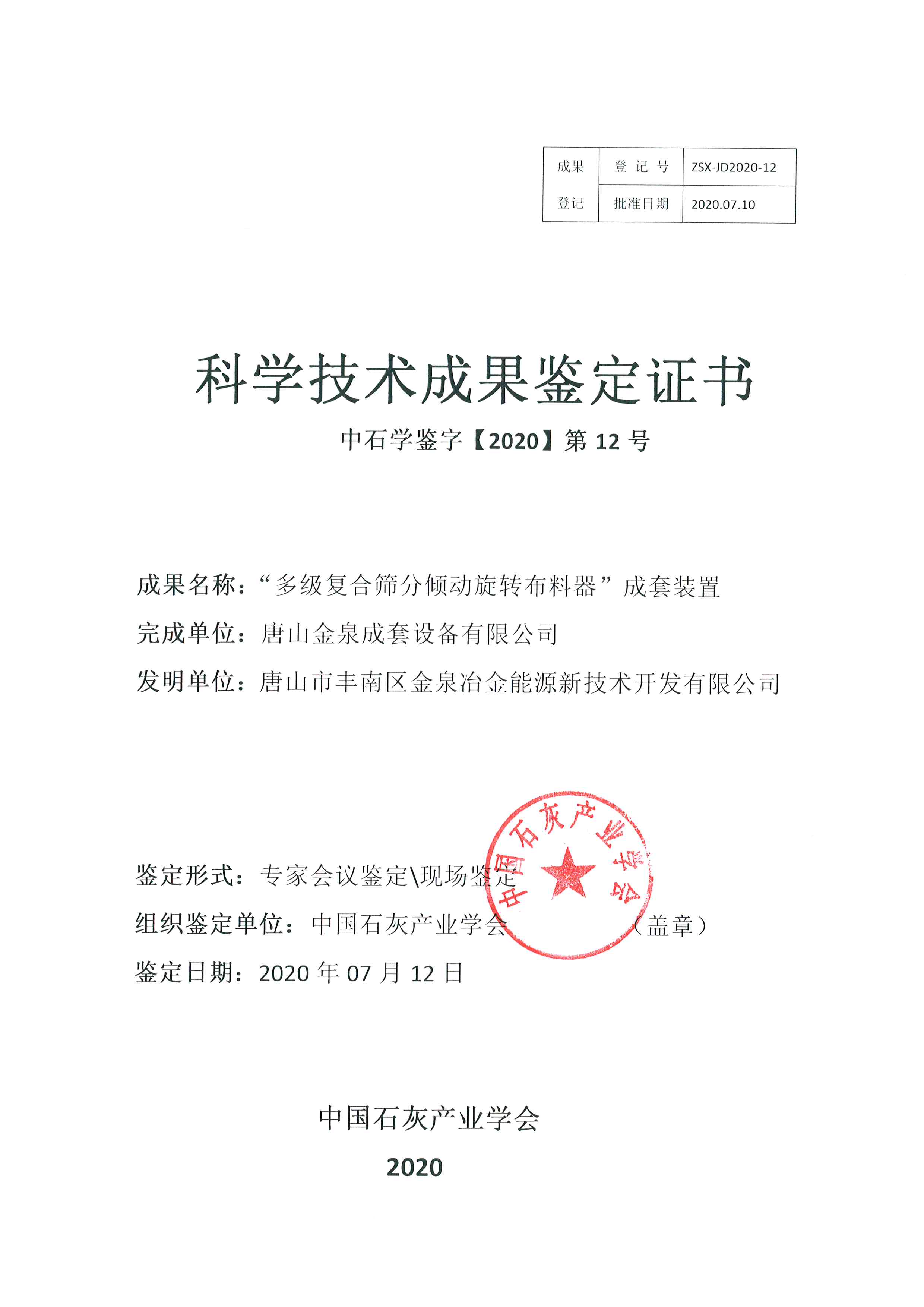 2020年07月12日,由中国石灰产业学会专委会主持,在唐山市组织召开的“石灰行业新产品(新技术)科技成果专项鉴定会议”落下帷幕,“唐山金泉冶化科技产业集团”旗下“唐山金泉成套设备有限公司”和“唐山市丰南区金泉冶金能源新技术开发有限公司”的两项技术和一款产品顺利通过鉴定委员会成果鉴定。其中,对“新一代多级复合筛分倾动旋转布料器”成套装置的首台定型产品进行了专家会议鉴定和现场应用考察鉴定。
